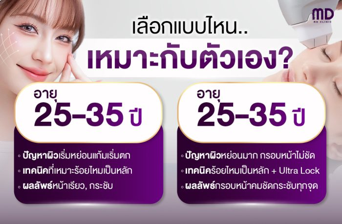 หากคุณกำลังลังเลว่าจะเริ่มจากอะไร แนะนำให้ปรึกษาแพทย์ผู้เชี่ยวชาญ เพื่อประเมินสภาพผิวและโครงหน้า แล้วเลือกเทคนิค ร้อยไหมเป็นหลัก เสริม Ultra Lock เฉพาะจุด จะได้ผลลัพธ์สวยเป็นธรรมชาติที่สุด